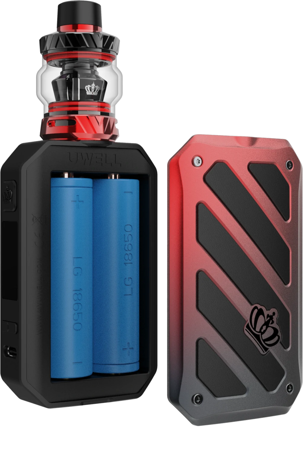 V pořadí již pátá řada oblíbeného gripu Uwell Crown se vyznačuje moderním zpracováním s designovými prvky, vysokým výkonem až 200W a pohodlným ovládáním. Po vložení 2ks monočlánků 18650 si můžete vybrat mezi režimy pro výkon a TCR. Díky šikovně umístěnému centr pinu snese Crown 5 i masivnější atomizery. Mezi jeho další přednosti patří ochrana proti zkratu, přehřátí a nízkému odporu. Tato sada obsahuje clearomizer Crown 5, který disponuje patentovanou samočisticí technologií, která absorbuje vytékající liquid v základně a následně ho dopraví do žhavící hlavy k odpařování. Využívá systém horního plnění - po odšroubování vrchní části plníte liquid otvorem přímo do těla clearomizeru o objemu 5ml, který nově minimalizuje protékání díky zpětnému ventilu z prvotřídního silikonu.