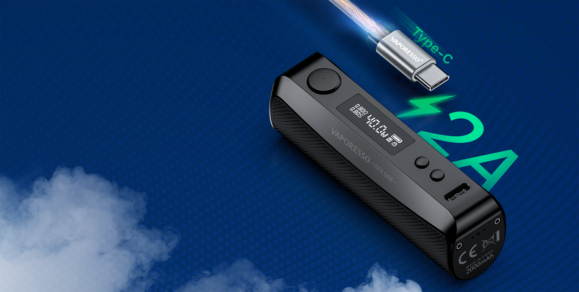 Grip Vaporesso GTX ONE se prezentuje vestavěnou baterií o kapacitě 2000mAh s rychlým 2A USB-C nabíjením a nastavitelným výkonem až 40W.